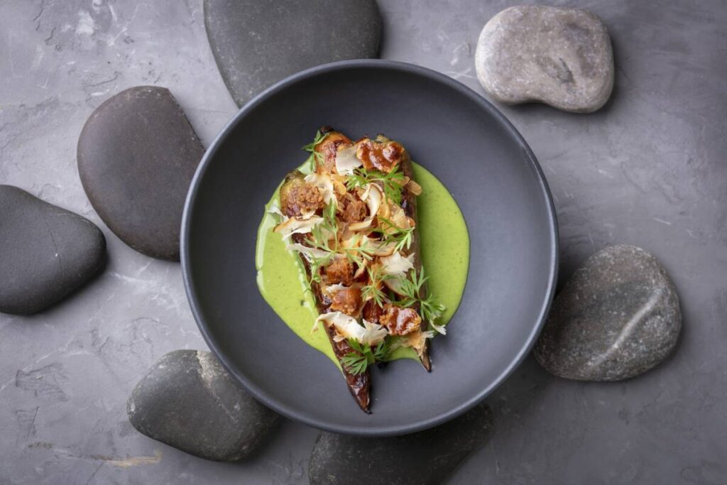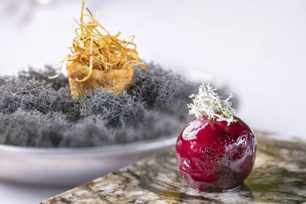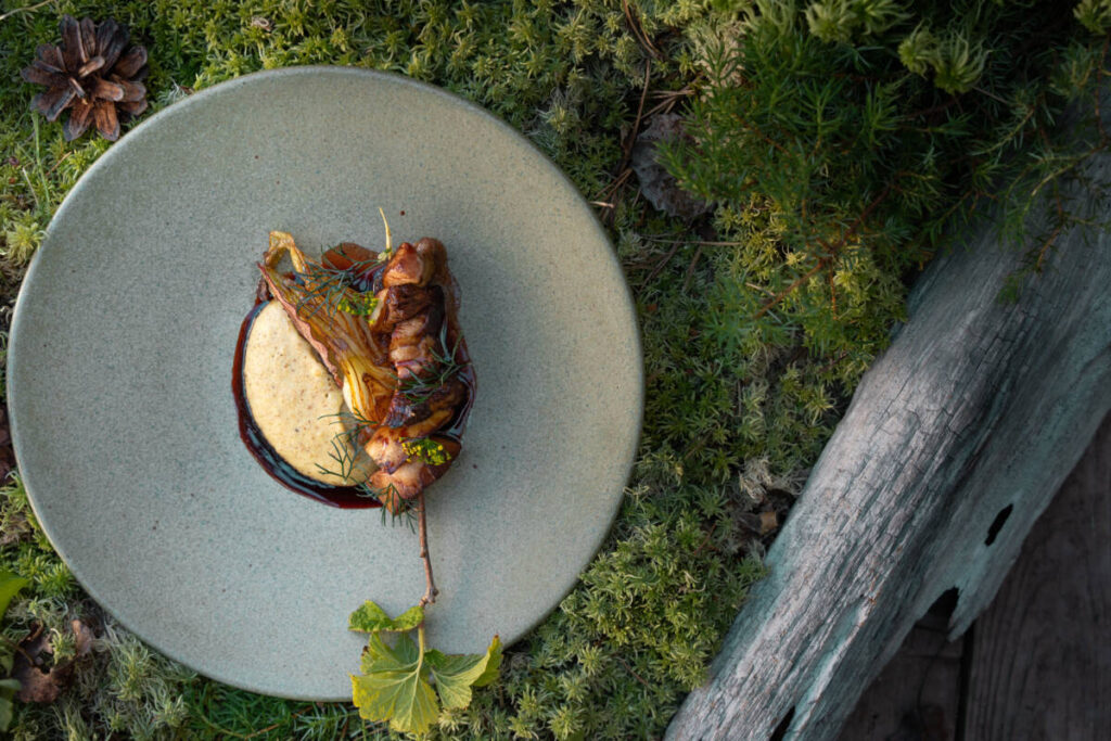 Оромо с хариусом и снытью, икра хариуса, яблочный гель. Оромо — это алтайское блюдо: рулет из тонкого теста с начинкой. В начинке — крем из каймака, а соус сделан из костей хариуса. Тартар из оленя с икрой из лесных грибов в картофельной корзиночке, украшенный сеном из лука: рубленое мясо северного оленя дополняется маслом из можжевельника, который вырос во дворе ресторана, и икрой из лесных грибов, собранных командой ресторана в Свердловской области.