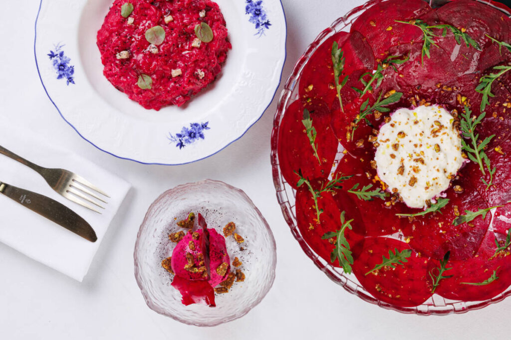 Шеф Сергей Кондаков сделал свёклу главным героем фестивального меню. Она звучит в ризотто с горгонзолой, превращается в мороженое со свекольным «стеклом» и крамблом, а также соседствует в карпаччо с нежной страчателлой и «землёй» из маслин. Каждое блюдо показывает, что скромный корнеплод может быть и ярким, и изысканным.