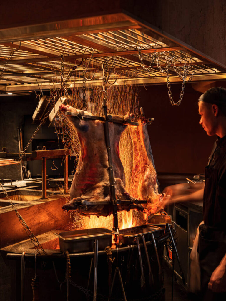 Эстака – необычный вертел с тремя перекладинами – придумали в Южной Америке, чтобы даже самый большой кусок мяса приготовить целиком. Равномерно запечь, сохранить сочность и сделать корочку идеально хрустящей. На молочного ягненка нужно не меньше восьми часов, но это только часть процесса. До этого еще сутки – в маринаде с тимьяном, розмарином, кориандром, фенхелем и цедрой лимона, и еще двое — в камере сухого вызревания и только потом на огонь. Если в субботу прийти в Maya пораньше, можно наблюдать, как медленно-медленно поворачивают эстака на асадо, сбрызгивая глянцевую корочку душистым брайном. Кульминация наступает в четыре, когда ягненка начнут разделывать, раскладывая по тарелкам с чимичурри из зелени, чеснока и оливкового масла.