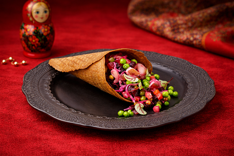 Ресторан подхватывает тренд на русскую культуру и предлагает взглянуть на нее через призму китча и доброй иронии. С каких вау-блюд начать знакомство с проектом, рассказываем ниже. Строганина из омуля с прибамбасами — один из главных деликатесов кухни северных народов. В данном случае строганину делают из замороженного омуля, которого нарезают тонкими слайсами, подают в ледяных ладошках и в окружении густых облаков азота. Прибамбасы — это обожженный лимон и так называемая «маканина» из соли, перца и специй, в которую принято макать рыбу, чтобы сделать ее вкус ярче и выразительней. Винегрет с маринованными маслятами и ароматным подсолнечным маслом — в отличие от классической версии в него добавляют маслята собственной маринации и квашеную капусту, а подают салат в хрустящем ржаном рожке. Разбить рожок гостям предлагают самостоятельно. Ассорти тарталеток на хрустящем запеченном тесте — c форелью домашнего посола, сливочным сыром и фиалками; с печенью трески, зеленью и щучьей икрой; Сибирская тушенка с мятым картофелем и брусникой. Десерт «Снегирь» вдохновлен главным талисманом проекта. Корпус в виде птицы из шоколадной глазури расписан вручную, а внутри скрывается йогуртовый мусс с вареной сгущенкой, компоте из брусники и миндальный бисквит.